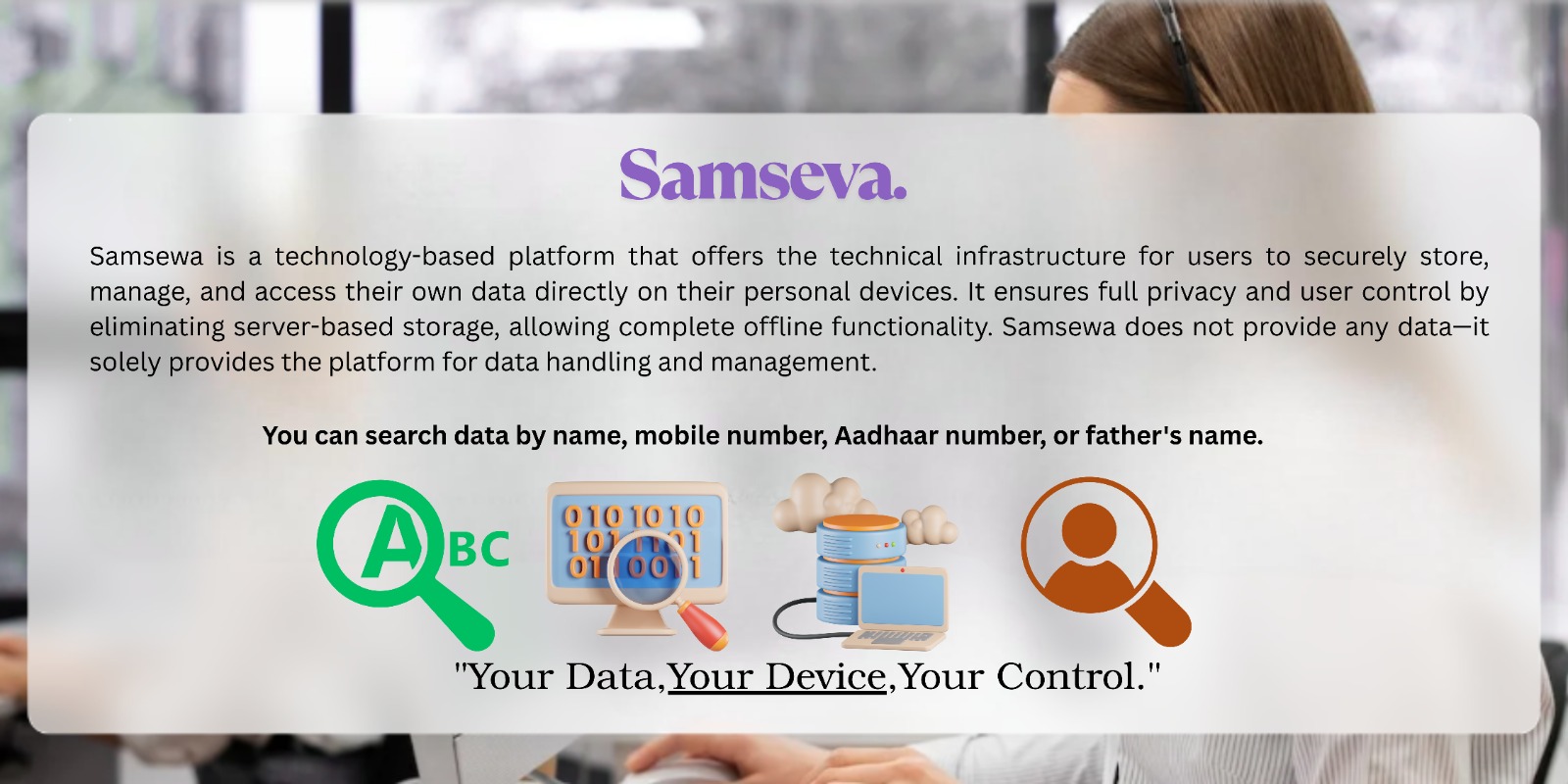 Importantly, Samsewa Lookup does not provide or store any user data on external servers. The platform solely provides the technical infrastructure, ensuring that all data remains securely stored on the user’s device. Users retain full control and access to their information, even without an internet connection, ensuring both privacy and independence.